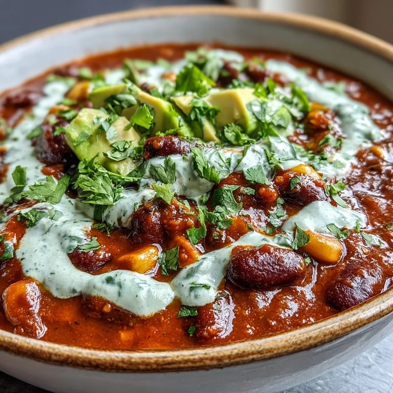 For years I made chili the traditional way, and it was fine—hearty and warming and completely forgettable. Then I started adding that lime crema almost as an accident, and suddenly people were talking about the recipe weeks later. The cool tang against the warm earthiness is what stops this from being just another bean chili; it's the contrast that your palate actually craves without knowing it.
