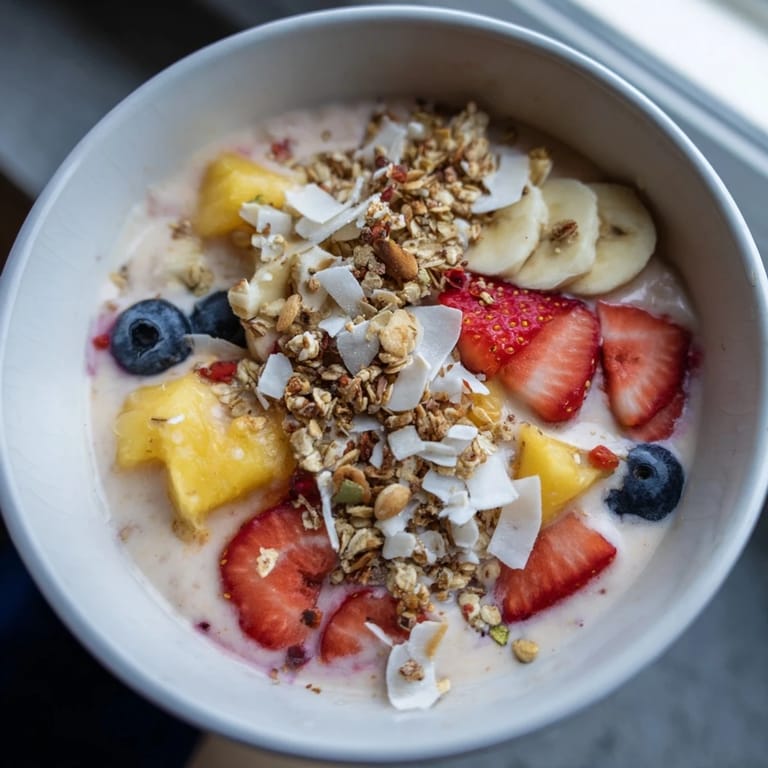 - Toppings (optional): 1/4 cup granola, 2 tablespoons shredded coconut, 2 tablespoons chopped nuts (e.g. almonds walnuts), fresh fruit slices