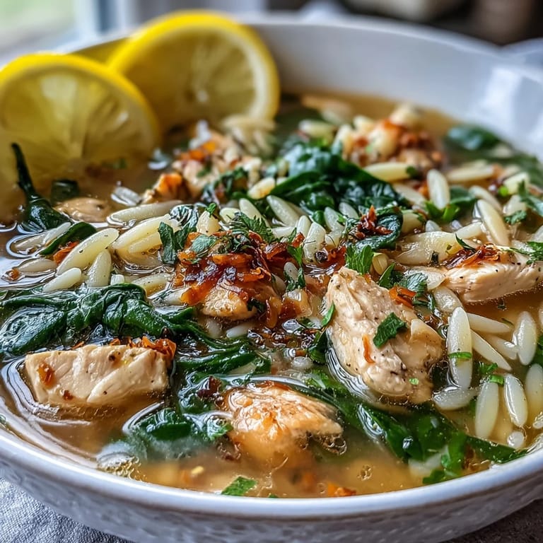 Pin it The soul of this soup lies in its layers. It begins with the gentle sauté of yellow onion, carrots, and celery in olive oil—the classic aromatic base that perfumes the kitchen and sets the stage for everything that follows. Garlic joins next, coaxing out its warmth and depth, before the diced chicken goes in to take on just a little colour. Then comes the broth, the bay leaf, and dried oregano, transforming the pot into something deeply savoury and inviting. The orzo cooks right in the broth, absorbing all those flavours as it swells into tender little grains. Finally, a generous handful of baby spinach wilts in at the very end, alongside the lemon zest and juice that give this soup its signature brightness. Every spoonful is a balance of savoury and citrusy, hearty and fresh.