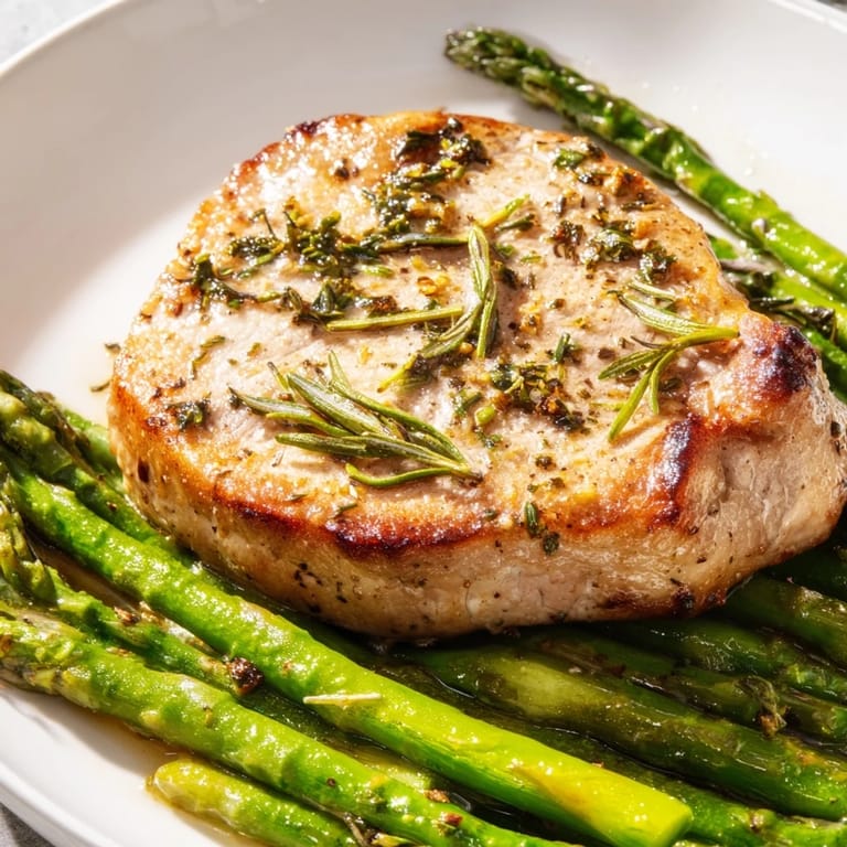 Pin it Tender pork chops seared and roasted with fresh herbs, zesty lemon, and crisp asparagus for a vibrant, easy weeknight meal made all in one pan.