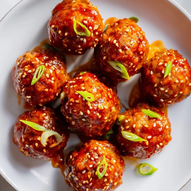 Pin it Juicy meatballs glazed with a sweet and spicy sriracha-honey sauce, perfect as crowd-pleasing appetizers or party bites.