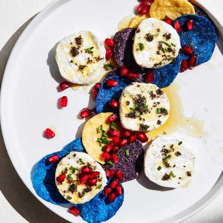 - Sprinkle chives and pepper directly onto the cheese rounds, then scatter pomegranate seeds along the chip river like little rubies. This is where the dish comes alive.