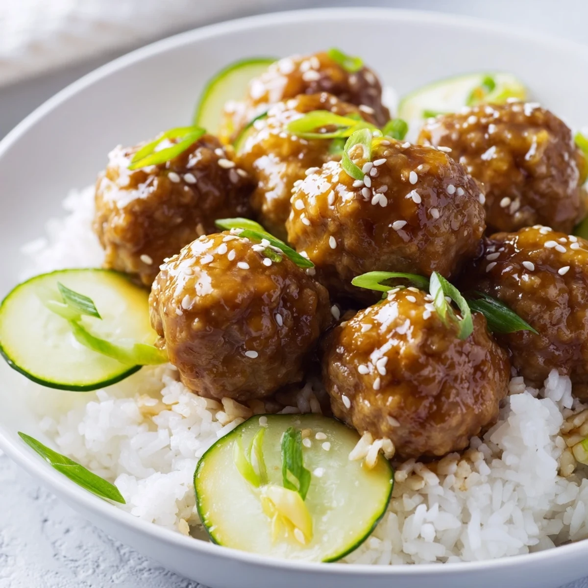 - Divide your warm rice among four bowls, top with meatballs and a generous spoonful of sauce, then scatter fresh cucumber slices, toasted sesame seeds, and spring onion garnish across the top. Serve right away while everything is warm.