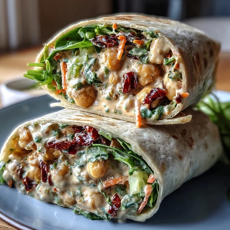 Pin it There's something about a really good wrap that makes lunch feel less like an obligation and more like a small victory. I discovered this chickpea salad version on a Tuesday when I had nothing but canned chickpeas, a jar of sun-dried tomatoes, and the vague idea that mashing them together might actually work. Twenty minutes later, I was rolling up something so creamy and satisfying that I made a second batch before dinner just to have extras on hand. The tangy sun-dried tomatoes paired with the savory chickpea base creates this unexpected depth that somehow tastes both comforting and bright at the same time.